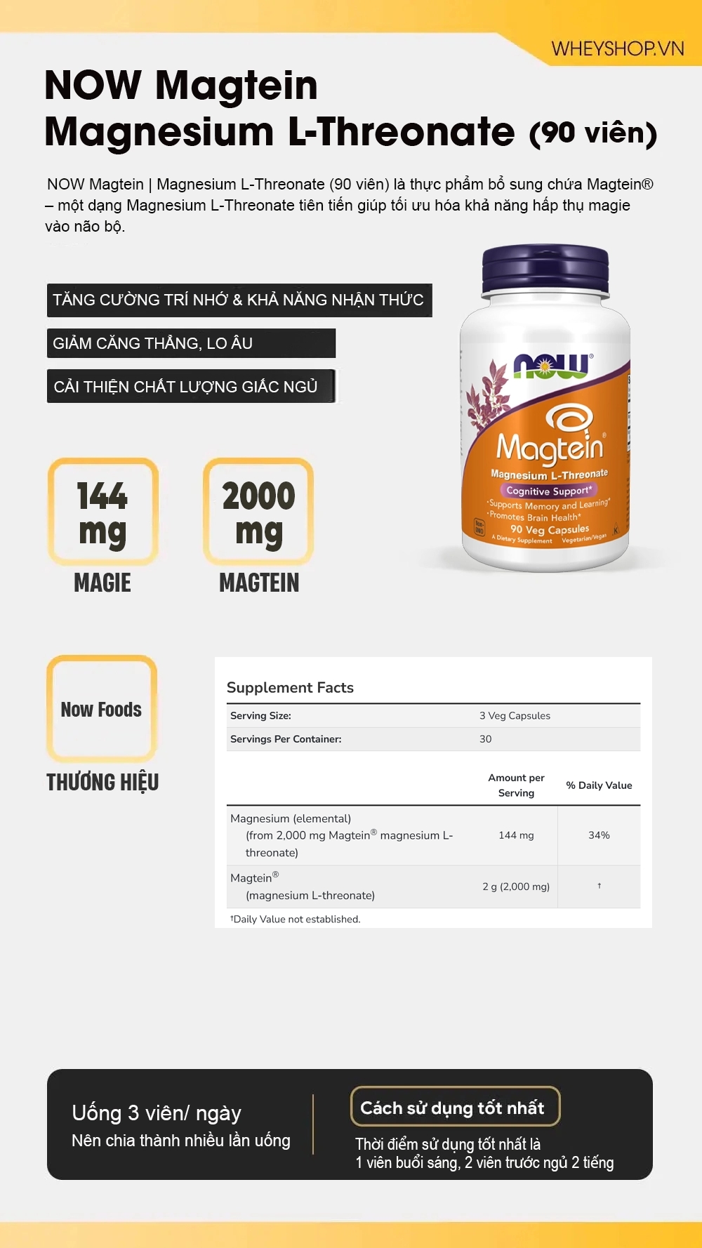 | Thành phần chính | NOW Magtein | Magnesium L-Threonate (90 viên) |