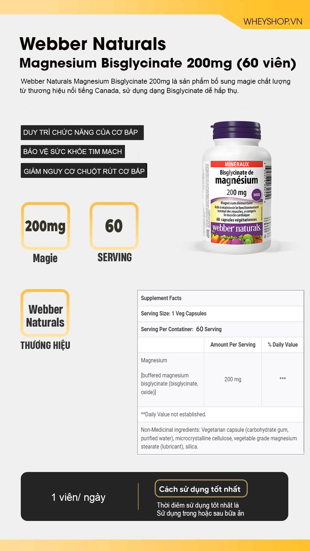 Hỗ trợ tim mạch ổn định – Webber Naturals Magnesium Bisglycinate 200mg giúp điều hòa nhịp tim, hỗ trợ tuần hoàn máu và giảm nguy cơ co thắt mạch máu.